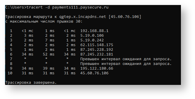 Для определения маршрута, то есть пути прохождения пакетов до сервера payments111.paysecure.ru, используется команда в командной строке (cmd):