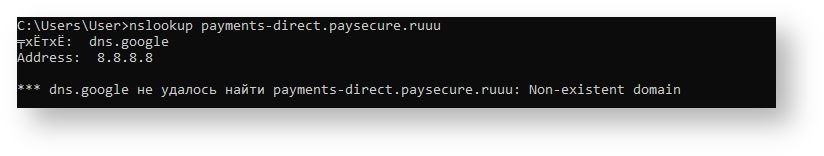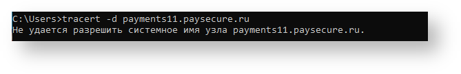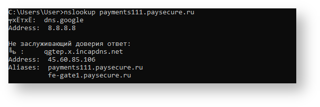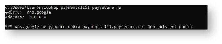 Для диагностики службы DNS, проверки DNS записей сервера payments-direct.paysecure.ru и обнаружения проблем, связанных с разрешением имен в системе DNS используется команда в командной строке (cmd):