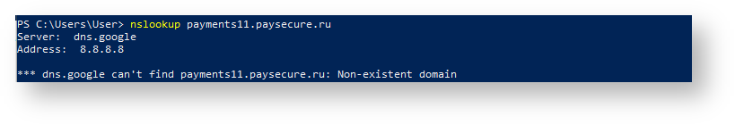 Для диагностики службы DNS, проверки DNS записей сервера payments111.paysecure.ru используется команда в командной строке (cmd):