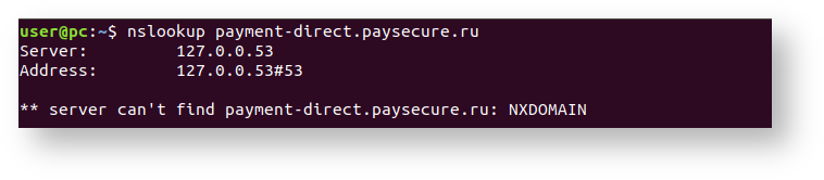 Для диагностики службы DNS, проверки DNS записей сервера payments-direct.paysecure.ru и обнаружения проблем, связанных с разрешением имен в системе DNS используется команда в терминале:
