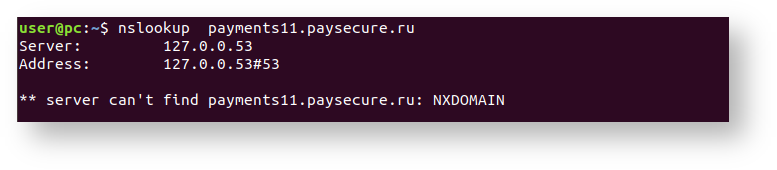 Для диагностики службы DNS, проверки DNS записей сервера payments111.paysecure.ru используется команда в терминале:
