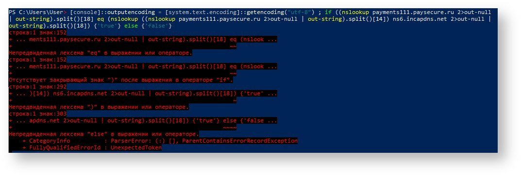 [console]::outputencoding = [system.text.encoding]::getencoding("utf-8") ; if ((nslookup payments.paysec.by 2>out-null | out-string).split()[18] -eq (nslookup ((nslookup payments.paysec.by 2>out-null | out-string).split()[14]) ns6.incapdns.net 2>out-null | out-string).split()[18]) {'true'} else {'false'}
