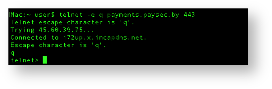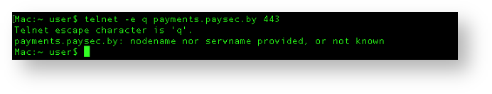 Для проверки доступности 443 порта (HTTPS) сервера payments.paysec.by из сети пользователя применяется команда в терминале: