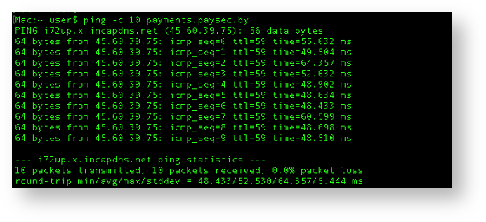 Для проверки целостности и качества соединения с сервером payments.paysec.by используется команда в терминале: