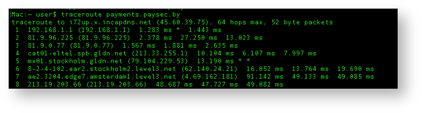 Для определения маршрута, то есть пути прохождения пакетов до сервера payments.paysec.by используется команда в терминале: