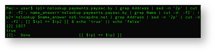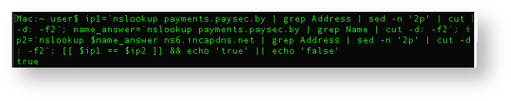 ip1=`nslookup payments.paysec.by | grep Address | sed -n '2p' | cut -d: -f2`; name_answer=`nslookup payments.paysec.by | grep Name | cut -d: -f2`; ip2=`nslookup $name_answer ns6.incapdns.net | grep Address | sed -n '2p' | cut -d: -f2`; [[ $ip1 == $ip2 ]] && echo 'true' || echo 'false'
