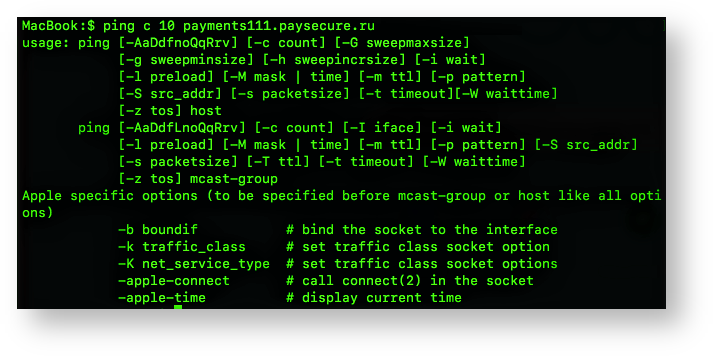 Для проверки целостности и качества соединения с сервером payments111.paysecure.ru используется команда в терминале: