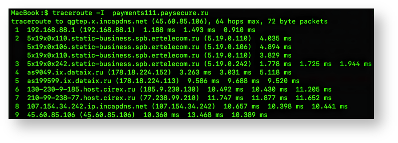 Для определения маршрута, то есть пути прохождения пакетов до сервера payments111.paysecure.ru, используется команда в терминале: