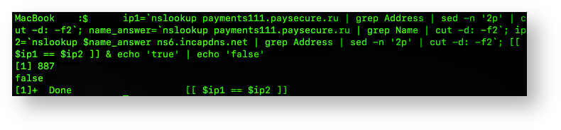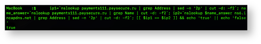 ip1=`nslookup payments111.paysecure.ru | grep Address | sed -n '2p' | cut -d: -f2`; name_answer=`nslookup payments111.paysecure.ru | grep Name | cut -d: -f2`; ip2=`nslookup $name_answer ns6.incapdns.net | grep Address | sed -n '2p' | cut -d: -f2`; [[ $ip1 == $ip2 ]] && echo 'true' || echo 'false'