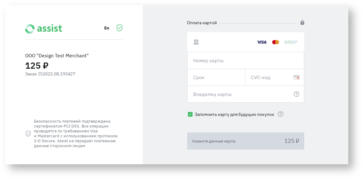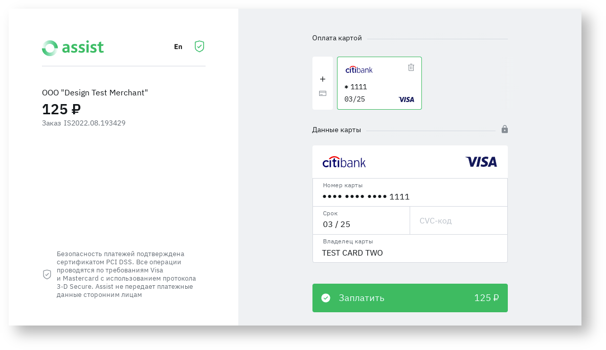 Если у клиента имеется более одной сохраненной карты, то все они отобразятся на платежной странице, чтобы клиент смог выбрать из них нужную для осуществления платежа.