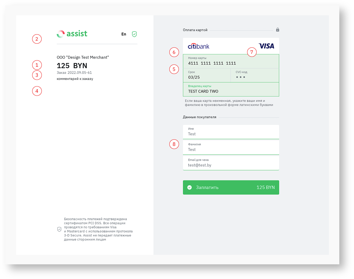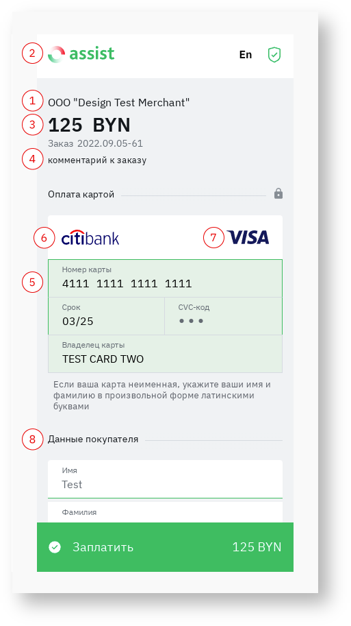 На нижеследующих изображениях красными цифрами обозначены элементы платежной страницы.