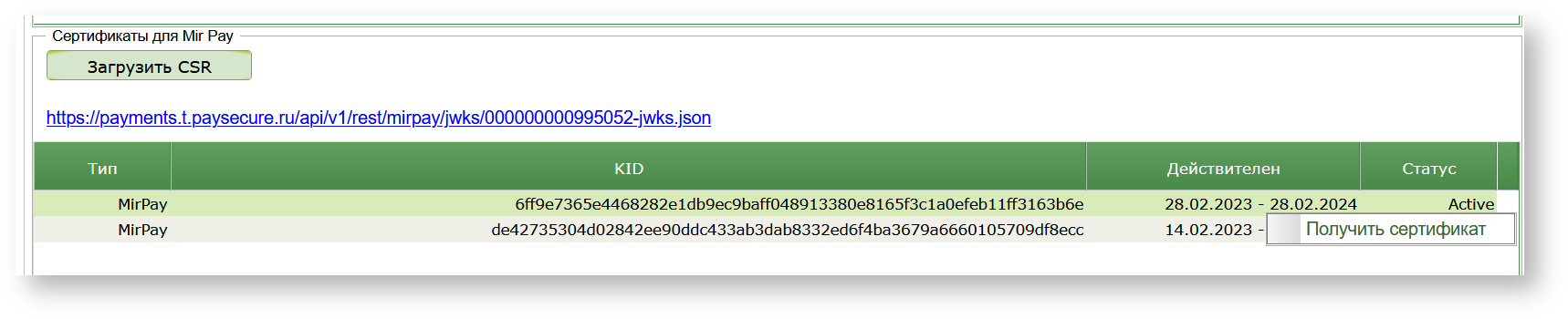 В этом блоке отображается таблица текущих сертификатов Mir Pay предприятия.
