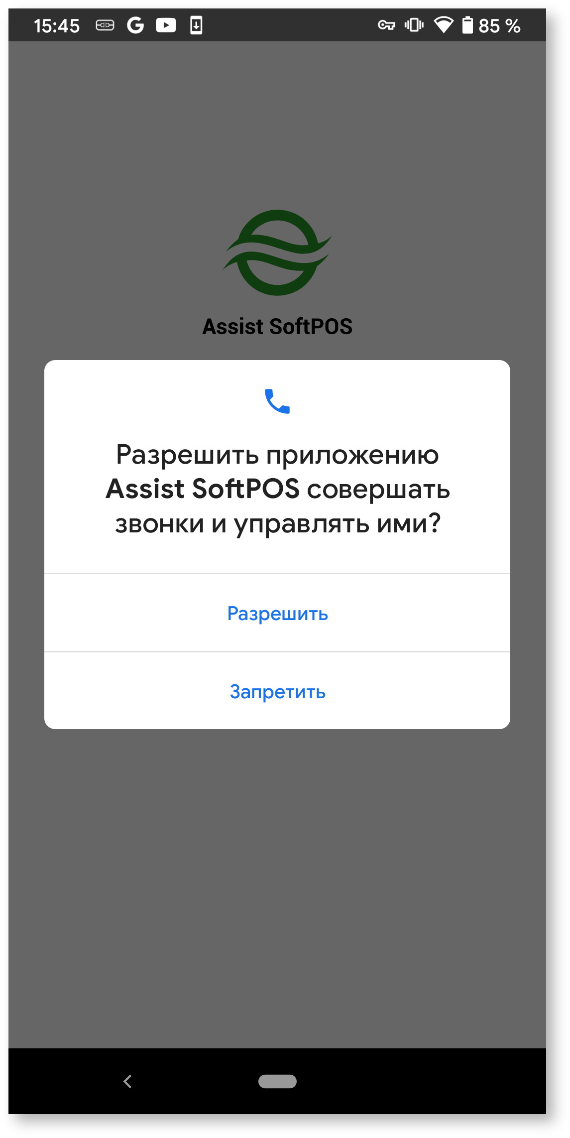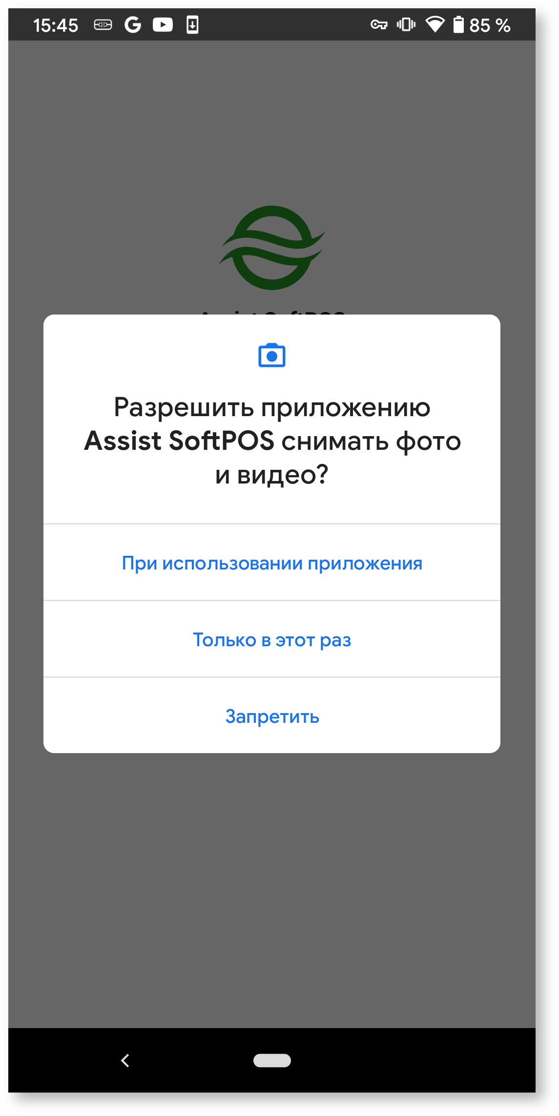 При первоначальном запуске приложения Assist SoftPOS необходимо подтвердить разрешение использования этим приложением камеры и телефона: