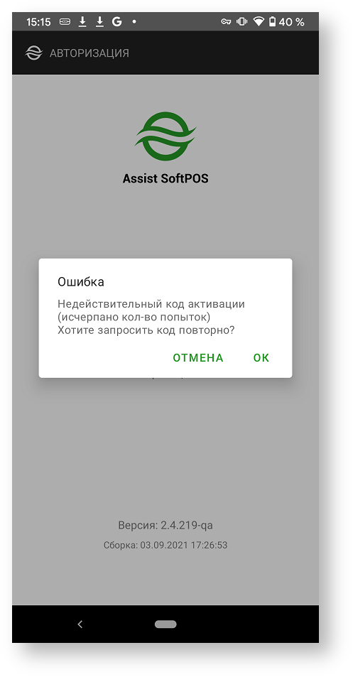 Если все три возможные попытки ввода кода (одноразового пароля) использованы неудачно, то отобразится следующее сообщение: