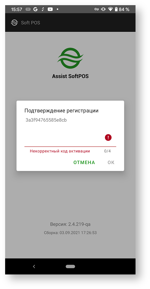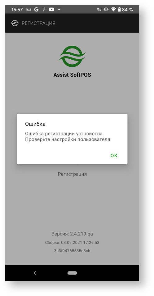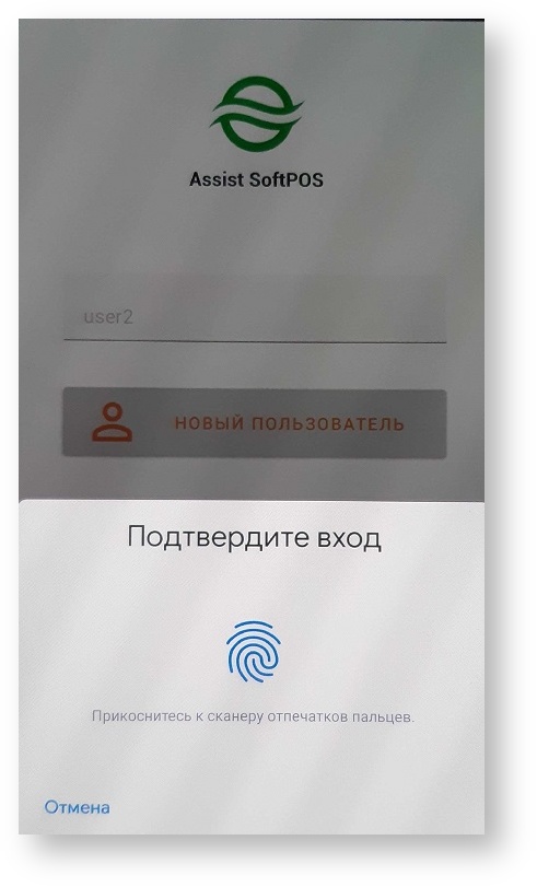 При первоначальном запуске приложения Assist SoftPOS необходимо зарегистрировать нового пользователя приложения. Для этого используются наименование учетной записи пользователя и пароль, выданные администратором системы.